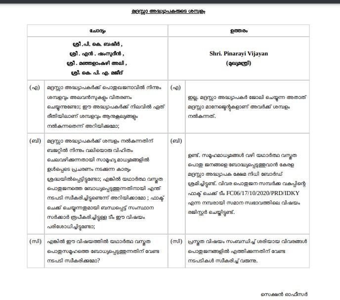 മദ്റസാധ്യാപകര്ക്ക് സര്ക്കാര് ശമ്പളം സംബന്ധിച്ച എംഎല്എമാരുടെ ചോദ്യങ്ങള്ക്ക് ന്യൂനപക്ഷ ക്ഷേമ വകുപ്പിന്റെ ചുമതലയുള്ള മുഖ്യമന്ത്രി പിണറായി വിജയന് നിയമസഭയില് നല്കിയ മറുപടി