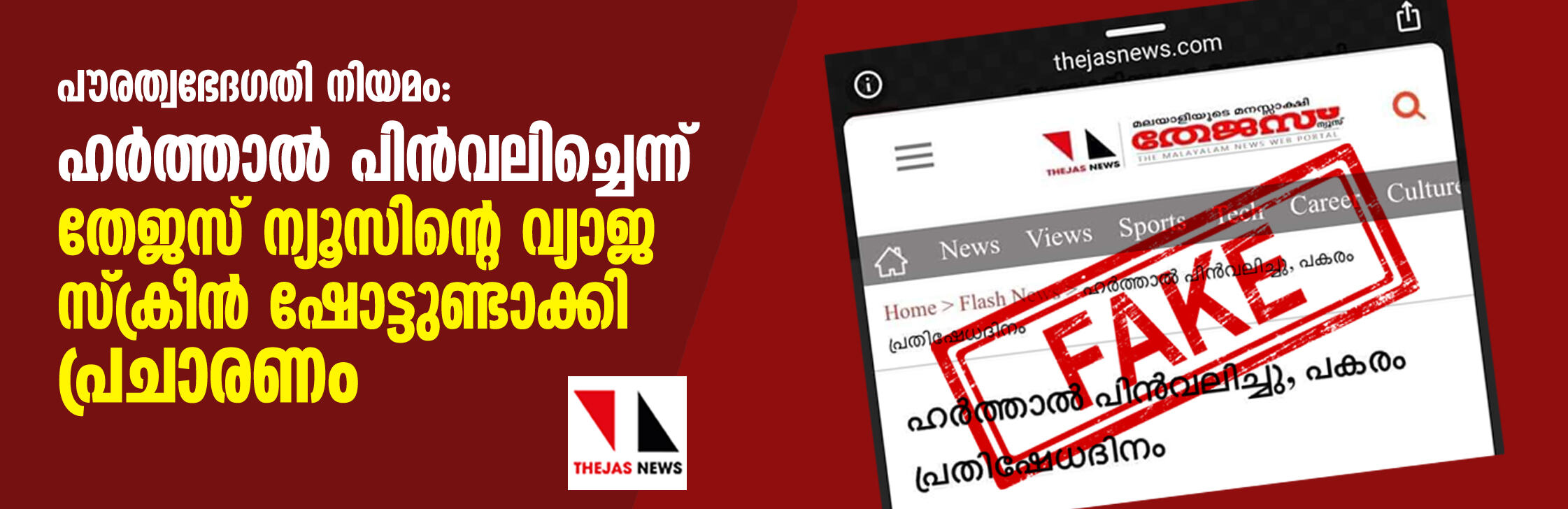 പൗരത്വഭേദഗതി നിയമം: ഹര്ത്താല് പിന്വലിച്ചെന്ന് തേജസ് ന്യൂസിന്റെ സ്ക്രീന് ഷോട്ടുണ്ടാക്കി വ്യാജപ്രചാരണം