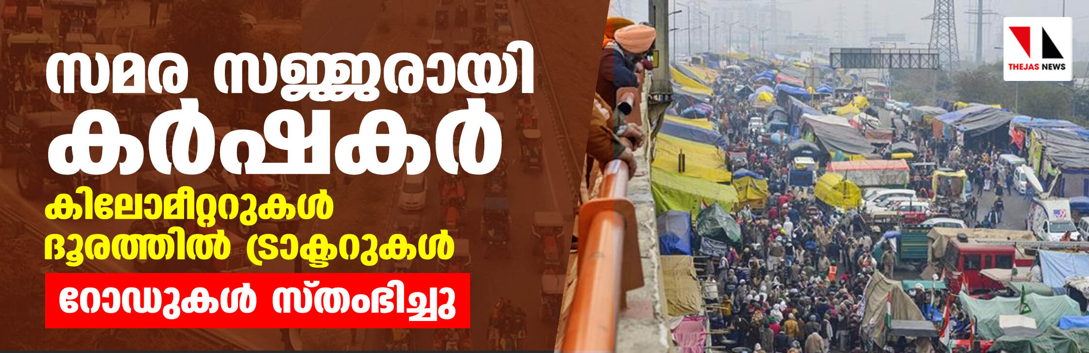 സമര സജ്ജരായി കര്ഷകര്; കിലോമീറ്ററുകള് ദൂരത്തില് ട്രാക്ടറുകള്, റോഡുകള് സ്തംഭിച്ചു