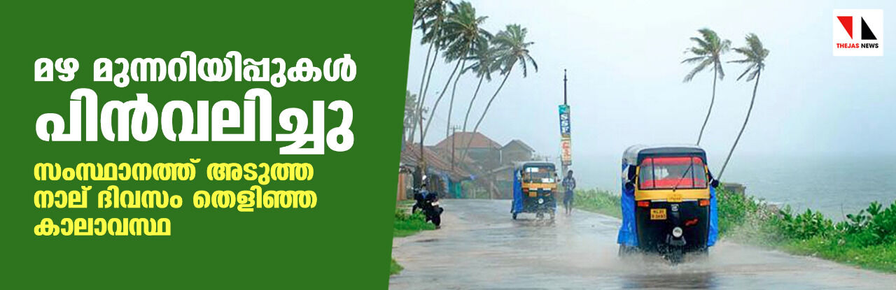 മഴ മുന്നറിയിപ്പുകള് പിന്വലിച്ചു; സംസ്ഥാനത്ത് അടുത്ത നാല് ദിവസം തെളിഞ്ഞ കാലാവസ്ഥ