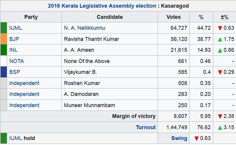 ലോക്സഭാ തിരഞ്ഞെടുപ്പിന്റെ ചരിത്രത്തിലെല്ലാം ചെങ്കൊടി പാറിയിരുന്ന കാസര്കോട്ടിന്റെ മണ്ണിലും കഴിഞ്ഞ തവണത്തെ രാഹുല് ഇഫക്റ്റില് അടിതെറ്റിയിരുന്നു. രാജ്മോഹന് ഉണ്ണിത്താനു മുന്നില് സിപിഎം അടിയറവ് പറഞ്ഞത് കാസര്കോട് നിയോജക മണ്ഡലത്തില് ഇക്കുറിയും യുഡിഎഫിന്റെ ആത്മവിശ്വാസം വര്ധിപ്പിക്കു. മുസ് ലിം ലീഗിലെ എന് എ നെല്ലിക്കുന്ന് ആണ് ഇപ്പോള് മണ്ഡലത്തെ പ്രതിനിധീകരിക്കുന്നത്. കാസര്കോഡ് നഗരസഭ, മൊഗ്രാല് പുത്തൂര്, മധൂര്, ബദിയഡുക്ക, കുംബഡാജെ, ബേലൂര്, ചെങ്കള, കാറഡുക്ക എന്നീ പഞ്ചായത്തുകള് ഉള്പ്പെട്ട മണ്ഡലം നഷ്ടപ്പെടില്ലെന്ന പ്രതീക്ഷയില് തന്നെയാണ് ലീഗ് നേതൃത്വവും. അഴീക്കോട് നിന്ന് കെ എം ഷാജിയെ മാറ്റുകയാണെങ്കില് പകരം ചോദിച്ചതു കാസര്കോട് ആണെന്നതു തന്നെ ഇതിലെ ഫലത്തെ കുറിച്ചുള്ള വിശ്വാസമാവണം. 1980 മുതല് സി ടി അഹമ്മദലിയെന്ന അമരക്കാരനിലൂടെ നഷ്ടപ്പെടാതെ സൂക്ഷിച്ചിരുന്ന മണ്ഡലത്തില് രണ്ടു തവണയായി എന് എ നെല്ലിക്കുന്ന് തന്നെയാണ് വിജയസാരഥി. ഇവിടെയും ബിജെപി തന്നെയാണ് രണ്ടാമതെങ്കിലും എളുപ്പം ജയിച്ചുകയറാനാവുമെന്ന പ്രതീക്ഷയൊന്നുമില്ല.