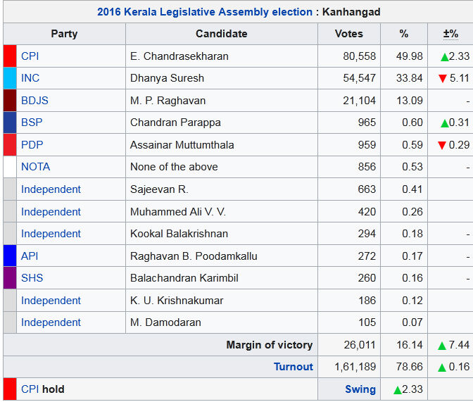 2008ലെ നിയമസഭാ മണ്ഡല പുനര്നിര്ണയത്തിലൂടെയാണ് കാഞ്ഞങ്ങാട് മണ്ഡലം ഉണ്ടായത്. തുടര്ന്നു നടന്ന രണ്ട് തിരഞ്ഞെടുപ്പിലും സിപി ഐയുടെ ഇ ചന്ദ്രശേഖരനാണ് ജനപ്രതിനിധി. പിണറായി മന്ത്രിസഭയിലെ റവന്യൂ മന്ത്രിയായ ചന്ദ്രശേഖരന് ഇക്കുറി സീറ്റുണ്ടാവുമോയെന്നു കണ്ടറിയണം. സിപി ഐയില് മൂന്നു തവണ മല്സരിച്ചവര്ക്കാണ് വിലക്കെങ്കിലും യുവരക്തങ്ങള്ക്കു സീറ്റ് വേണമെന്ന ആവശ്യം ശക്തമായാല് അദ്ദേഹത്തിനു സീറ്റ് നഷ്ടപ്പെട്ടേക്കും. 2011ല് കോണ്ഗ്രസിന്റെ എം സി ജോസ് നേടിയതില് നിന്നു 100 വോട്ട് പോലും അധികം പിടിക്കാന് 2016ല് ധന്യ സുരേഷിനായില്ല. ഇ ചന്ദ്രശേഖരനാവട്ടെ 66640ല് നിന്ന് വോട്ട് 80558ലേക്ക് കുതിക്കുകയായിരുന്നു. ജില്ലയിലെ തന്നെ എല്ഡിഎഫിന് ഉറച്ച വിശ്വാസമുള്ള മറ്റൊരു മണ്ഡലമാണിത്. കാഞ്ഞങ്ങാട് നഗരസഭ, അജാനൂര്, ബളാല്, കള്ളാര്, കിനാനൂര്, കരിന്തളം, കോടോംബേളൂര്, മടിക്കൈ, പനത്തടി പഞ്ചായത്തുകള് ഉള്പ്പെടുന്ന മണ്ഡലത്തില് നിന്ന് ചെങ്കൊടി പാറിക്കാന് ആരെത്തുമെന്ന് കാത്തിരുന്നു കാണാം.
