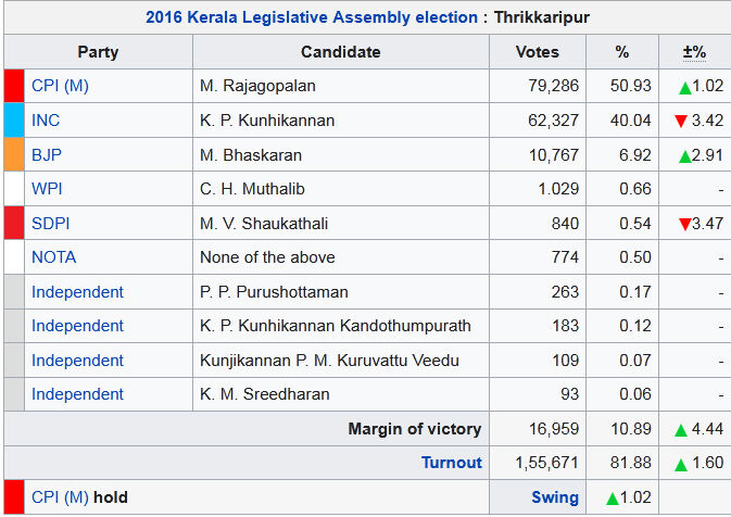കയ്യൂര് സഖാക്കളുടെയും ചീമേനി സഖാക്കളുടെയും ചരിത്രം പേറുന്ന തൃക്കരിപ്പൂര് നിയമസഭാ മണ്ഡലം കാസര്കോട് ജില്ലയിലെ സിപിഎമ്മിന്റെ ഉറച്ച കോട്ട തന്നെയാണ്. അല്ഭുതങ്ങള് സംഭവിച്ചില്ലെങ്കില് ഇക്കുറിയും അതിനു മാറ്റമുണ്ടാവാന് സാധ്യതയില്ലെന്നാണു രാഷ്ട്രീയ നിരീക്ഷകരുടെ വിലയിരുത്തല്. കാരണം സിപിഎമ്മിനെ സംബന്ധിച്ചിടത്തോളം പാര്ട്ടി ഘടകങ്ങള് നന്നായി പ്രവര്ത്തിക്കുന്ന മണ്ഡലങ്ങളിലൊന്നാണിത്. നീലേശ്വരം നഗരസഭ, ചെറുവത്തൂര്, തൃക്കരിപ്പൂര്, ഈസ്റ്റ് എളേരി, വെസ്റ്റ് എളേരി, കയ്യൂര്, ചീമേനി, പീലിക്കോട്, പടന്ന, വലിയപറമ്പ് പഞ്ചായത്തുകള് ഉള്പ്പെട്ട തൃക്കരിപ്പൂര് മണ്ഡലത്തില് നിന്നു ആദ്യകാലങ്ങളിലൊക്കെ നിയമസഭ കണ്ടത് സിപിഎമ്മിന്റെ അതികായരായിരുന്നു. എകെജിയുടെ മരുമകന് പി കരുണാടകരനില് നിന്നു തുടങ്ങി ഒ ഭരതന്, സാക്ഷാല് ഇ കെ നായനാര് എന്നിവരും ഇവിടെ നിന്നു ചെങ്കൊടി പാറിച്ചിട്ടുണ്ട്. പിന്നീട് രണ്ടുവീതം തവണ കെ പി സതീഷ് ചന്ദ്രനും കെ കുഞ്ഞിരാമനും കാത്ത മണ്ഡലത്തില് നിന്നു കഴിഞ്ഞ തവണ 17000ത്തോളം വോട്ടിന്റെ ഭൂരിപക്ഷത്തില് വെന്നിക്കൊടി പാറിച്ചത് എം രാജഗോപാലനാണ്. ഇക്കുറിയും ഇദ്ദേഹത്തിന് അവസരം നല്കിയേക്കുമെന്നാണു റിപോര്ട്ടുകള്.