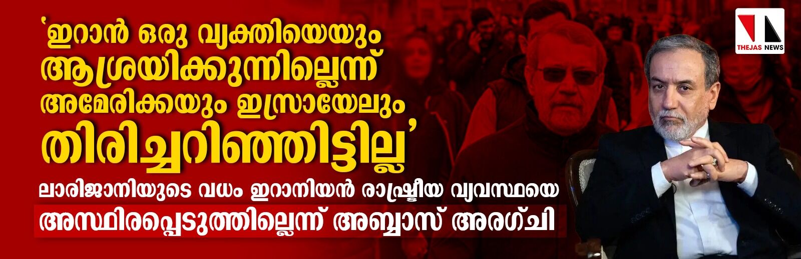 ലാരിജാനിയുടെ കൊലപാതകം ബുധനാഴ്ച പുലര്ച്ചെ തെഹ്റാന് സ്ഥിരീകരിച്ചതിന് ശേഷം അല് ജസീറയ്ക്ക് നല്കിയ അഭിമുഖത്തിലാണ് അരാഗ്ചി നിലപാട് വ്യക്തമാക്കിയത്. ഇറാന് സര്ക്കാര് ഒരു വ്യക്തിയെയും ആശ്രയിക്കുന്നില്ലെന്ന് അമേരിക്കയും ഇസ്രായേലും ഇതുവരെ തിരിച്ചറിഞ്ഞിട്ടില്ല.