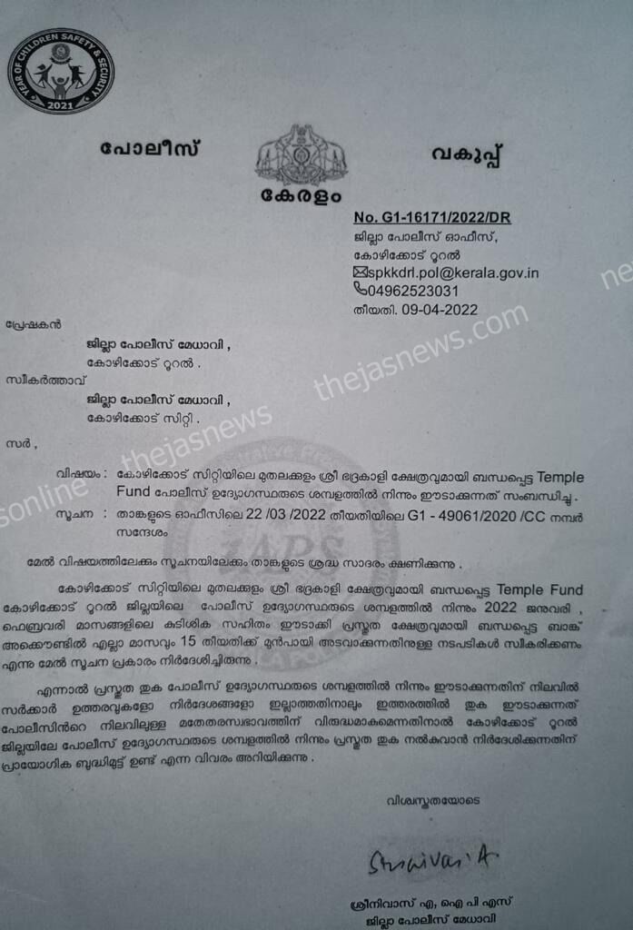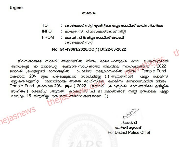 ക്ഷേത്രത്തിന് വേണ്ടി പോലിസുകാരില് നിന്ന് നിര്ബന്ധിത പിരിവ് വേണ്ട; നിര്ദേശവുമായി കോഴിക്കോട് റൂറല് എസ്പി