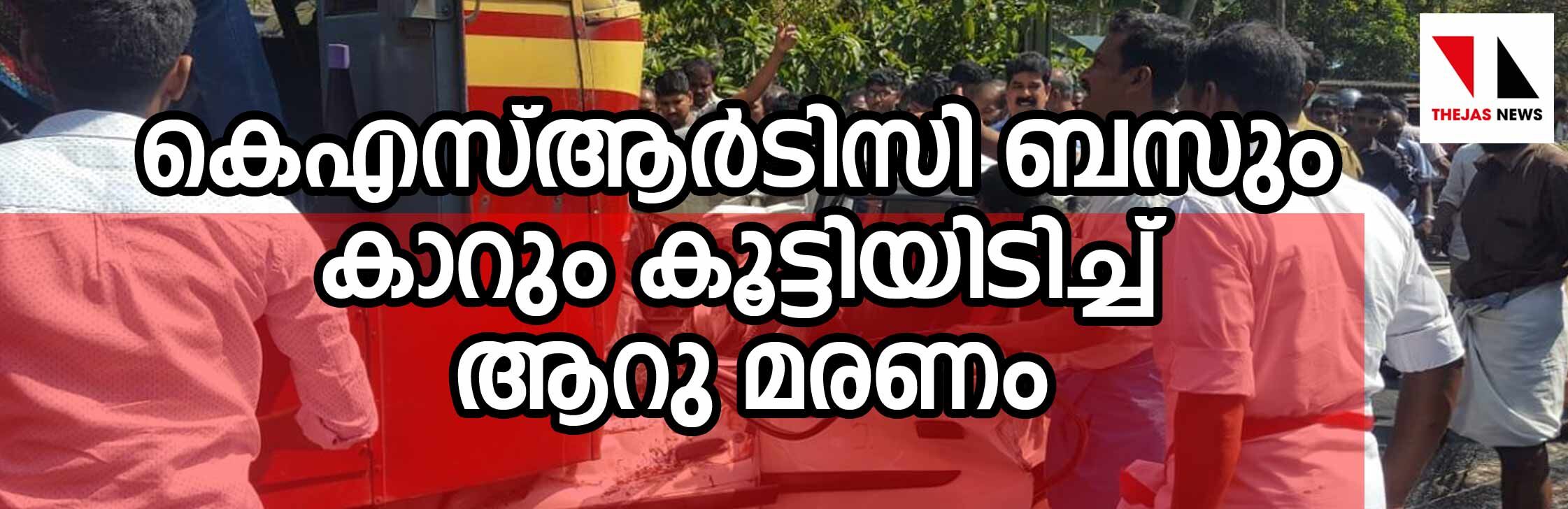 കൊല്ലം: കൊല്ലത്ത് എംസി റോഡില് ആയൂരിന് സമീപം കെഎസ്ആര്ടിസി ബസും കാറും കൂട്ടിയിടിച്ച് മരിച്ചവരുടെ എണ്ണം ആറായി.ഒരു കുടുംബത്തിലെ അഞ്ചുപേരുള്പ്പെടെയാണ് ആറുപേര് മരിച്ചത്. റാന്നി വടശ്ശേരിക്കര തലച്ചിറ കൈലാസ് ഭവനില് മിനി(45), മകള് അഞ്ജന(20), സഹോദര ഭാര്യ സ്മിത(27), മകന് അഭിനജ്(8), മകള് ഹര്ഷ(3), കാര് ഡ്രൈവര് ചെങ്ങന്നൂര് ആല കോണത്തേത്ത് വീട്ടില് അരുണ്(21) എന്നിവരാണ് മരിച്ചത്. ഫയര്ഫോഴ്സെത്തി കാറ് വെട്ടിപ്പൊളിച്ചാണ് മൃതദേഹങ്ങള് പുറത്തെടുത്തത്. ഉച്ചയ്ക്ക് ഒന്നരയോടെ ആയൂരിലെ അകമണ്ണിലാണ് അപകടം. കൊട്ടാരക്കരയില് നിന്ന് തിരുവനന്തപുരം ഭാഗത്തേക്ക് വരികയായിരുന്നു കെഎസ്ആര്ടിസി സൂപ്പര്ഫാസ്റ്റ് ബസും എതിര് ദിശയില് വടശേരിക്കരയിലേക്ക് പോകുകകയായിരുന്ന കാറും കൂട്ടിയിടിച്ചാണ് അപകടം. മരിച്ചവര് പത്തനംതിട്ട വടശ്ശേരിക്കര സ്വദേശികളാണ്. ഏഴു പേരാണു കാറിലുണ്ടായിരുന്നത്. ചെങ്ങന്നൂര് ആലാ കോണത്തേത്ത് വീട്ടില് സുദര്ശനന്-രജനി ദമ്പതികളുടെ മകനാണ് എ എസ് അരുണ് സുദര്ശനന് എന്ന ചന്തു(21). കഴിഞ്ഞ മൂന്നു മാസക്കാലമായി ഡ്രൈവറായി ജോലി ചെയ്യുകയാണ് അരുണ് കൂടാതെ കാറ്ററിങ് സര്വീസ് ജോലിക്കും പോവുന്നുണ്ടായിരുന്നു. റാന്നി വടശ്ശേരിക്കരയിലുള്ള ബന്ധുക്കളുമായി തിരുവനന്തപുരത്ത് ക്ഷേത്ര ദര്ശനം നടത്തി മടങ്ങി വരുമ്പോഴായിരുന്നു അപകടം. ഏക സഹോദരി എ എസ് ആതിര(ആയുര്വേദ നഴ്സ്).മരിച്ചവരുടെ മൃതദേഹങ്ങള് കടയ്ക്കല് താലൂക്ക് ആശുപത്രിയിലേക്ക് മാറ്റി.