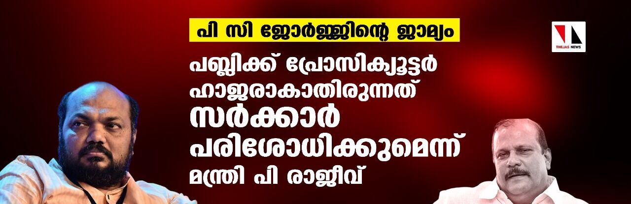 പി സി ജോര്ജ്ജിന്റെ ജാമ്യം: പബ്ലിക്ക് പ്രോസിക്യൂട്ടര് ഹാജരാകാതിരുന്നത് സര്ക്കാര് പരിശോധിക്കുമെന്ന് മന്ത്രി പി രാജീവ്
