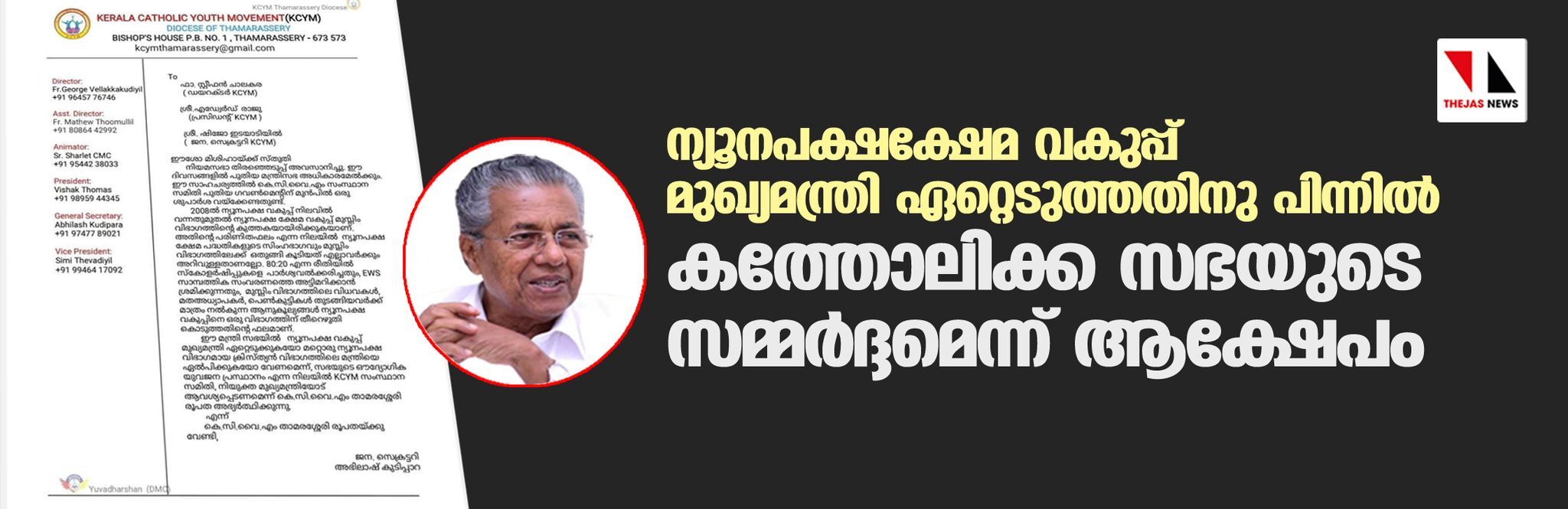 സി വൈഎം സംസ്ഥാന സമിതിക്കു നല്കിയ കത്താണ് പുറത്തായിരിക്കുന്നത്. 2008ല് ന്യൂനപക്ഷ വകുപ്പ് നിലവില് വന്നതുമുതല് മുസ് ലിം സമുദായത്തിന്റെ കുത്തകയായിരിക്കുകയാണെന്നും ഈ മന്ത്രിസഭയില് വകുപ്പ് മുഖ്യമന്ത്രി ഏറ്റെടുക്കണമെന്നുമായിരുന്നു കത്തിലെ ആവശ്യം. സംഘപരിവാരവും ചില ക്രിസ്ത്യന് സഭകളും ഉന്നയിക്കുകയും പിന്നീട് ഇല്ലാക്കഥകളാണെന്ന് തെളിവുസഹിതം പുറത്തുവരികയും ചെയ്ത വാദങ്ങളും അതേപടി കത്തിലുണ്ടായിരുന്നു. നേരത്തേ കത്തോലിക്ക കോണ്ഗ്രസ് കമ്മിറ്റിയും ഇതേ ആവശ്യമുന്നയിച്ചിരുന്നു.