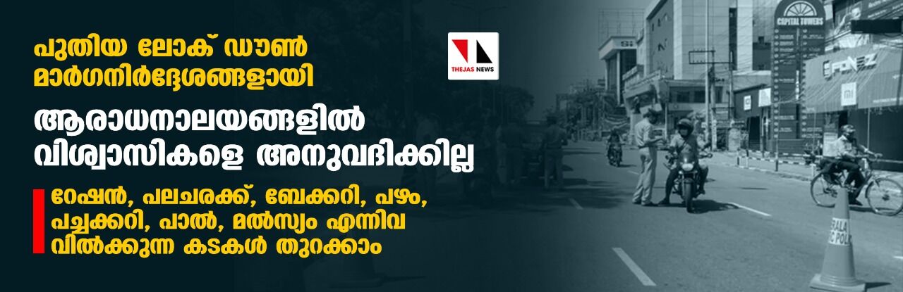 പുതിയ ലോക് ഡൗണ് മാര്ഗനിര്ദ്ദേശങ്ങളായി: ആരാധനാലയങ്ങളില് വിശ്വാസികളെ അനുവദിക്കില്ല; റേഷന്, പലചരക്ക്, ബേക്കറി,പഴം, പച്ചക്കറി, പാല്, മല്സ്യം എന്നിവ വില്ക്കുന്ന കടകള് തുറക്കാം