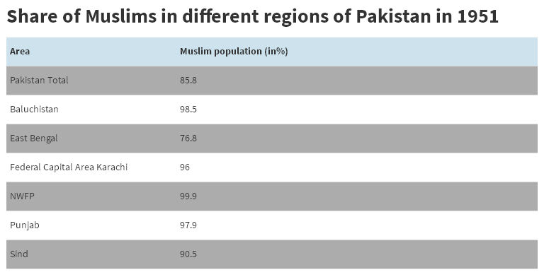 1951ലെ കാനേഷുമാരി പ്രകാരം പാകിസ്താന് എന്നറിയപ്പെട്ടിരുന്ന പ്രദേശത്തെ മൊത്തം ജനസംഖ്യയുടെ 96.56 ശതമാനവും മുസ്ലിംകളായിരുന്നു. ചുവടെയുള്ള പട്ടിക അവിഭക്ത പാകിസ്താനിലെ അഞ്ച് പ്രവിശ്യകളുടെയും മതപരമായ ഘടന വിശദമാക്കുന്നുണ്ട്.