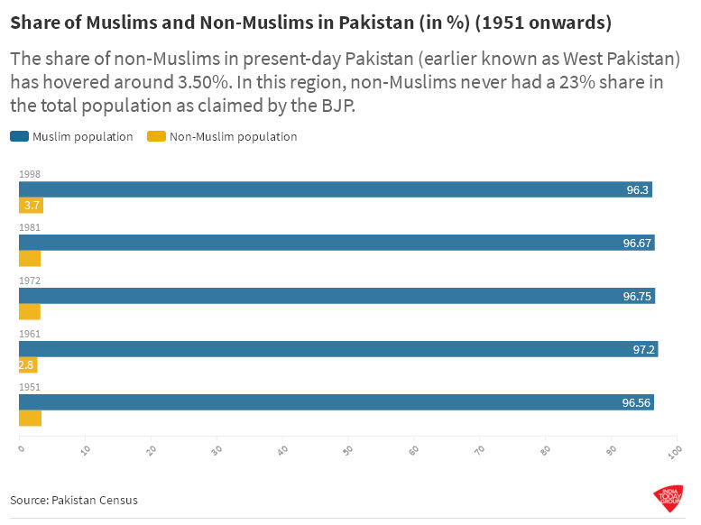 രണ്ടാമതായി, പാകിസ്ഥാനില് അമുസ്ലിംകളുടെ പങ്ക് 23 ശതമാനത്തില് നിന്ന് 3.7 ശതമാനമായി കുറഞ്ഞുവെന്ന് ബിജെപി വാദം. ഇതും തെറ്റാണ്, കാരണം പാകിസ്ഥാനിലെ അമുസ്ലിംകളുടെ വിഹിതം ആദ്യ സെന്സസ് മുതല് 3.5 ശതമാനമായിരുന്നു.