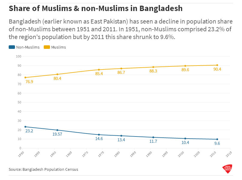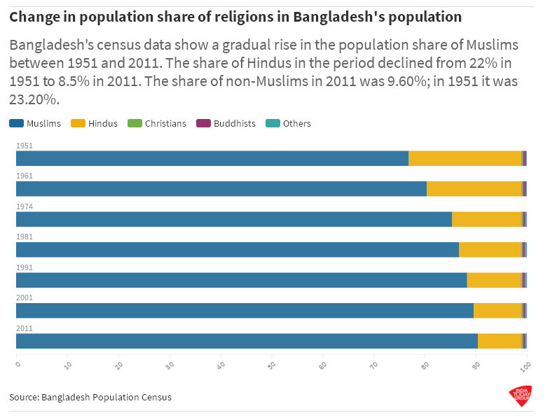മുസ്ലിം ജനസംഖ്യയില് ക്രമാനുഗത വര്ധനവുണ്ടായതായി 1951നും 2011നും ഇടയില് നടന്ന ബംഗ്ലാദേശിന്റെ കാനേഷുമാരി വിവരങ്ങള് വ്യക്തമാക്കുന്നു. 1951ല് 23.20 ശതമാനമുണ്ടായിരുന്ന ഹിന്ദുക്കള് 2011ല് എത്തിയപ്പോള് 8.5 ശതമാനവുമായി കുറഞ്ഞു. അമുസ്ലിംകളാവട്ടെ 9.60 ശതമാനവും ആയി കുറഞ്ഞു.