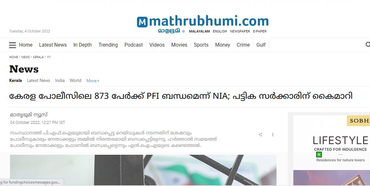 കേരള പോലിസിൽ പോപുലർ ഫ്രണ്ട് ഓഫ് ഇന്ത്യയുമായി ബന്ധമുണ്ടെന്ന് സംശയിക്കുന്ന ഉദ്യോഗസ്ഥരേക്കുറിച്ച് ദേശീയ അന്വേഷണ ഏജൻസി (എൻഐഎ) അന്വേഷണം ഊർജിതമാക്കിയെന്നും കഴിഞ്ഞ ദിവസത്തെ റെയ്ഡ് സംബന്ധിച്ച് നിരോധിത സംഘടനയുടെ ചില പ്രാദേശിക ശക്തി കേന്ദ്രങ്ങളിലെ നേതൃത്വങ്ങൾക്ക് മുന്നറിയിപ്പ് നൽകിയ പോലിസ് ഉദ്യോഗസ്ഥരും നിരീക്ഷണത്തിലാണെന്ന തരത്തിലാണ് വാർത്തകൾ വിവിധ ദൃശ്യ-പത്ര-ഓൺലൈൻ മാധ്യമങ്ങൾ വാർത്ത നൽകിയത്.