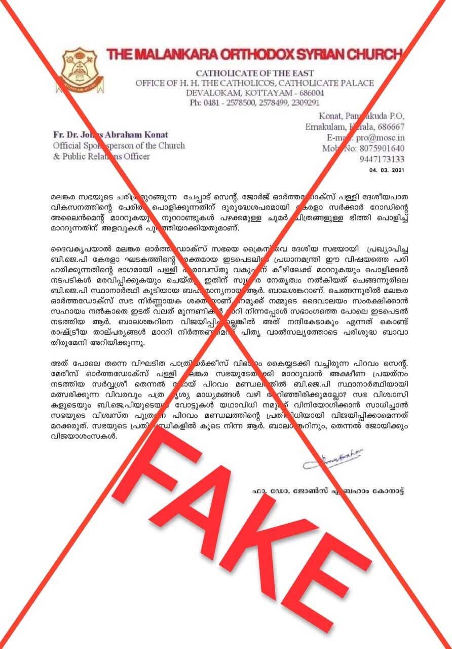 സംസ്ഥാന സര്ക്കാരിനെ വിമര്ശിച്ചും ബിജെപിക്ക് അനുകൂലിച്ചും ഉള്ളതായിരുന്നു വ്യാജ കത്ത്. 'മലങ്കര സഭയുടെ ചരിത്രമുറങ്ങുന്ന ചേപ്പാട് സെന്റ്. ജോര്ജ് ഓര്ത്തഡോക്സ് പള്ളി ദേശീയപാത വികസനത്തിന്റെ പേരില് പൊളിക്കുന്നതിന് ദുരുദ്ധേശപരമായി കേരളാ സര്ക്കാര് റോഡിന്റെ അലൈന്മെന്റ് മാറ്റുകയും നൂറ്റാണ്ടുകള് പഴക്കമുള്ള ചുമര് ചിത്രങ്ങളുള്ള ഭിത്തി പൊളിച്ച് മാറ്റുന്നതിന് അളവുകള് പൂര്ത്തിയാക്കിയതുമാണ്.