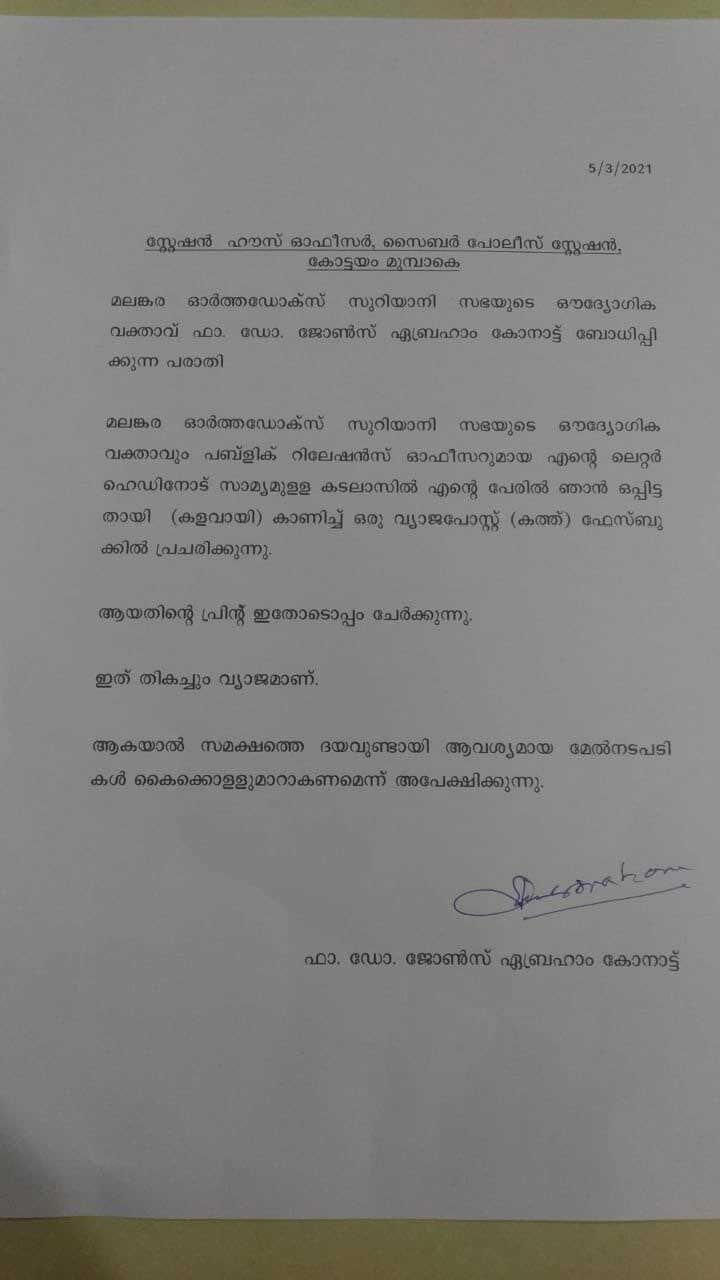 എന്നാല്, കത്തിനെതിരേ ഓര്ത്തഡോക്സ് സഭ പോലിസില് പരാതി നല്കി. മലങ്കര ഓര്ത്തഡോക്സ് സുറിയാനി സഭയുടെ ഔദ്യോഗിക വക്താവ് ഫാ. ഡോ. ജോണ്സ് എബ്രഹാം കോനാട്ട് ആണ് പരാതി നല്കിയത്. 'മലങ്കര ഓര്ത്തഡോക്സ് സുറിയാനി സഭയുടെ ഔദ്യോഗിക വക്താവും പബ്ലിക് റിലേഷന്സ് ഓഫിസറുമായ എന്റെ ലറ്റര് ഹെഡിനോട് സാമ്യമുള്ള കടലാസില് എന്റെ പേരില് ഞാന് ഒപ്പിട്ടതായി(കളവായി) കാണിച്ച് ഒരു വ്യാജ പോസ്റ്റ്(കത്ത്) ഫേസ്ബുക്കില് പ്രചരിക്കുന്നു. ആയതിന്റെ പ്രിന്റ് ഇതോടൊപ്പം ചേര്ക്കുന്നു. ഇത് തികച്ചും വ്യാജമാണ്.' ഓര്ത്തഡോക്സ് സഭ കോട്ടയം സൈബര് സ്റ്റേഷനില് നല്കിയ പരാതിയില് പറഞ്ഞു. വ്യാജ കത്തിനെതിരേ നടപടിയെടുക്കണമെന്നും സഭ പരാതിയില് ആവശ്യപ്പെട്ടു.