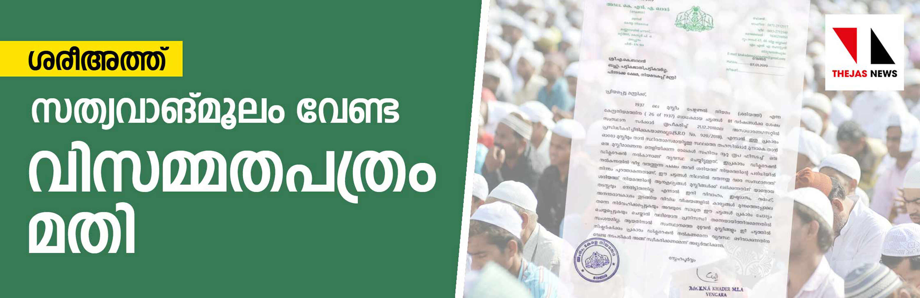 എല്ലാവരും സത്യവാങ്മൂലം നല്കുന്നതിനുപകരം നിയമം ബാധകമാക്കേണ്ടാത്തവര് വിസമ്മതപത്രം നല്കിയാല് മതിയെന്ന ബദല്നിര്ദേശവും കെഎന്എ ഖാദര് എംഎല്എ മുന്നോട്ടുവച്ചു. തുടര്ന്ന് മുഖ്യമന്ത്രി നേരിട്ട് ഇടപെട്ടു വ്യവസ്ഥ റദ്ദാക്കുകയായിരുന്നു. ചട്ടത്തില് അടിയന്തിര ഭേദഗതി കൊണ്ടുവരുമെന്നു ന്യുനപക്ഷ ക്ഷേമമന്ത്രി കെ ടി ജലീലൂം അറിയിച്ചു. രാഷ്ട്രീയാതിപ്രസരമുള്ള മേഖലകളില് മഹല്ല് കമ്മിറ്റികള് സര്ട്ടിഫിക്കറ്റ് നല്കുന്നതിനും മറ്റും എതിരാളികളെ ബുദ്ധിമുട്ടിക്കുമെന്നതും എല്ലാവരും സത്യവാങ്മൂലം നല്കണമെന്ന വ്യവസ്ഥ മുസ്ലിങ്ങളെ സര്ക്കാരിനെതിരാക്കുമെന്ന വിലയിരുത്തലും വ്യവസ്ഥ റദ്ദാക്കുന്നതിന് കാരണമായിട്ടുണ്ട്.
