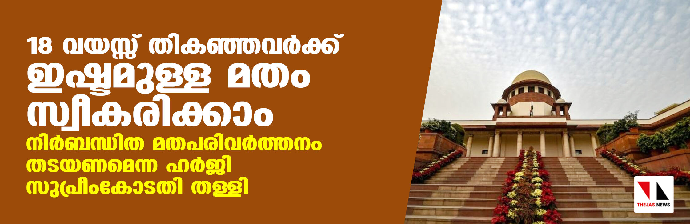 18 വയസ്സ് തികഞ്ഞവര്ക്ക് ഇഷ്ടമുള്ള മതം സ്വീകരിക്കാം; നിര്ബന്ധിത മതപരിവര്ത്തനം തടയണമെന്ന ഹര്ജി സുപ്രീംകോടതി തള്ളി