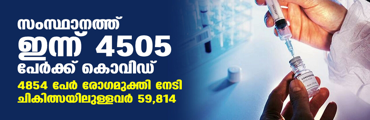 സംസ്ഥാനത്ത് ഇന്ന് 4505 പേര്ക്ക് കൊവിഡ്, 4854 പേര് രോഗമുക്തി നേടി; ചികിത്സയിലുള്ളവര് 59,814; ഇതുവരെ രോഗമുക്തി നേടിയവര് 9,61,789
