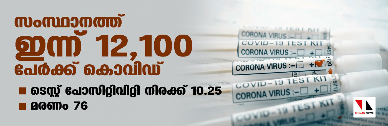 സംസ്ഥാനത്ത് ഇന്ന് 12,100 പേര്ക്ക് കൊവിഡ്; ടെസ്റ്റ് പോസിറ്റിവിറ്റി 10.25; മരണം 76