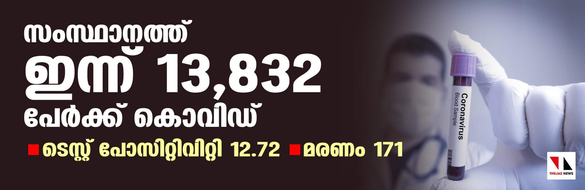 സംസ്ഥാനത്ത് ഇന്ന് 13,832 പേര്ക്ക് കൊവിഡ്; മരണം 171; ടെസ്റ്റ് പോസിറ്റിവിറ്റി നിരക്ക് 12.72