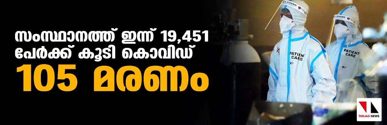 സംസ്ഥാനത്ത് ഇന്ന് 19,451 പേര്ക്ക് കൊവിഡ്; ടെസ്റ്റ് പോസിറ്റിവിറ്റി നിരക്ക് 13.97; മരണം 105