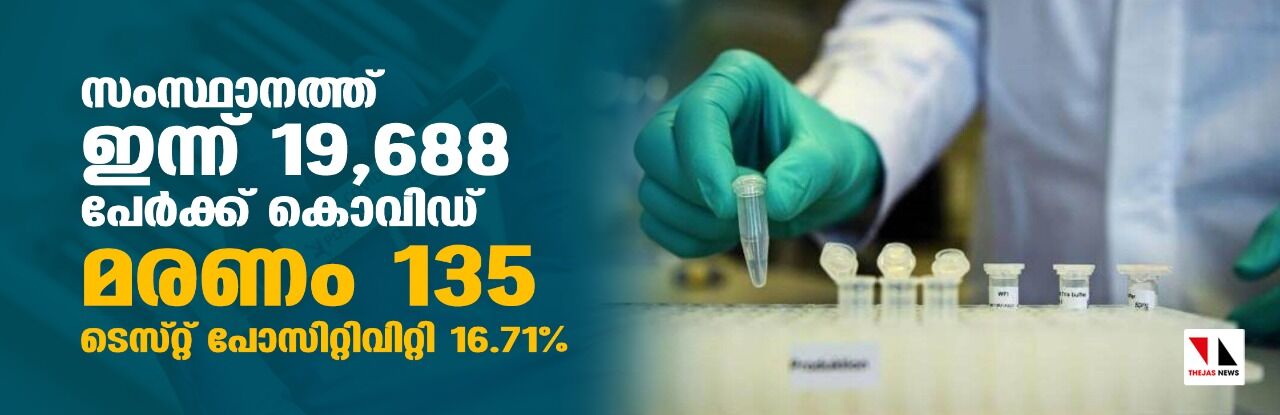 സംസ്ഥാനത്ത് ഇന്ന് 19,688 പേര്ക്ക് കൊവിഡ്; ടെസ്റ്റ് പോസിറ്റിവിറ്റി നിരക്ക് 16.71; മരണം 135