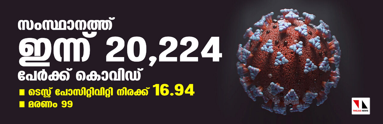 സംസ്ഥാനത്ത് ഇന്ന് 20,224 പേര്ക്ക് കൊവിഡ്; ടെസ്റ്റ് പോസിറ്റിവിറ്റി നിരക്ക് 16.94; മരണം 99