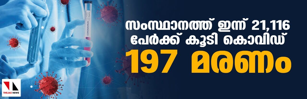 സംസ്ഥാനത്ത് ഇന്ന് 21,116 പേര്ക്ക് കൊവിഡ്; ടെസ്റ്റ് പോസിറ്റിവിറ്റി നിരക്ക് 16.15; മരണം 197
