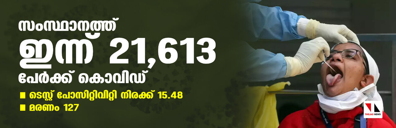 സംസ്ഥാനത്ത് ഇന്ന് 21,613 പേര്ക്ക് കൊവിഡ്; ടെസ്റ്റ് പോസിറ്റിവിറ്റി നിരക്ക് 15.48; മരണം 127