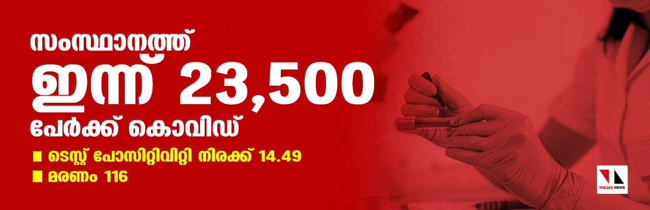 സംസ്ഥാനത്ത് ഇന്ന് 23,500 പേര്ക്ക് കൊവിഡ്; ടെസ്റ്റ് പോസിറ്റിവിറ്റി നിരക്ക് 14.49; മരണം 116