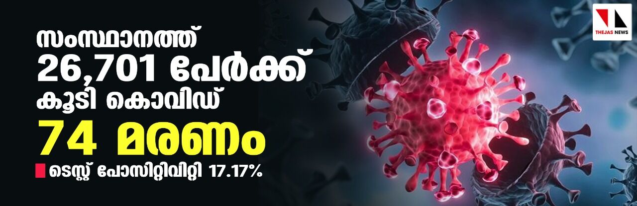 സംസ്ഥാനത്ത് ഇന്ന് 26,701 പേര്ക്ക് കൊവിഡ്; ടെസ്റ്റ് പോസിറ്റിവിറ്റി നിരക്ക് 17.17; മരണം 74