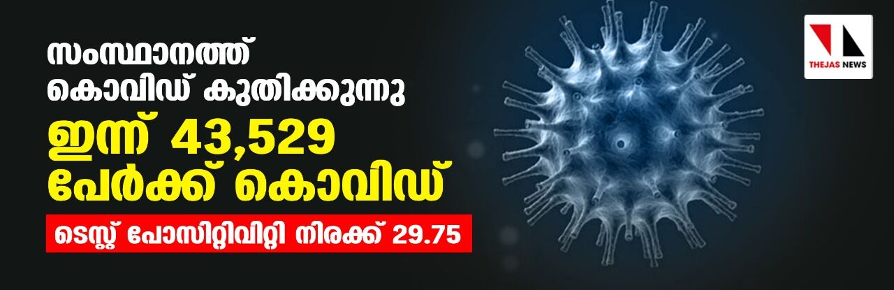 സംസ്ഥാനത്ത് കൊവിഡ് കുതിക്കുന്നു; ഇന്ന് 43,529 പേര്ക്ക് കൊവിഡ്; ടെസ്റ്റ് പോസിറ്റിവിറ്റി നിരക്ക് 29.75