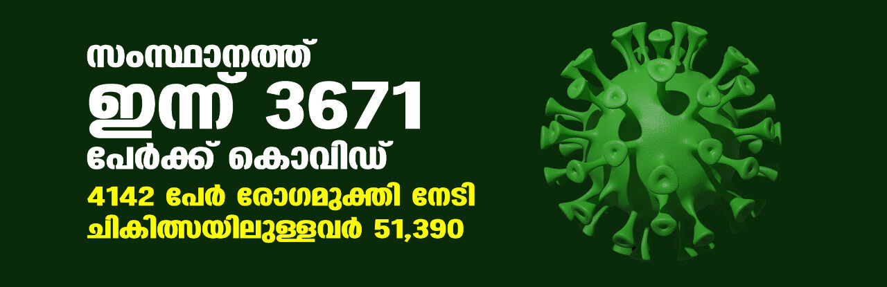 സംസ്ഥാനത്ത് ഇന്ന് 3671 പേര്ക്ക് കൊവിഡ്, 4142 പേര് രോഗമുക്തി നേടി; ചികിത്സയിലുള്ളവര് 51,390; ഇതുവരെ രോഗമുക്തി നേടിയവര് 9,96,514