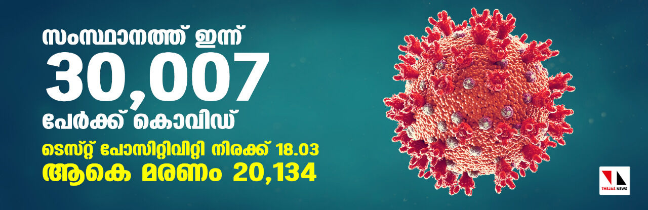 സംസ്ഥാനത്ത് ഇന്ന് 30,007 പേര്ക്ക് കൊവിഡ്; ടെസ്റ്റ് പോസിറ്റിവിറ്റി നിരക്ക് 18.03; മരണം 162