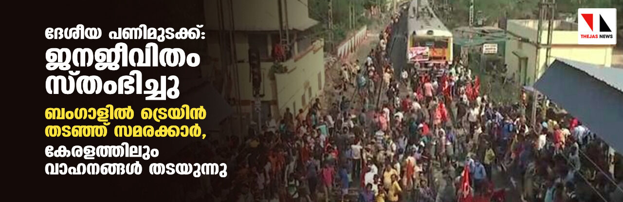 ദേശീയ പണിമുടക്ക്: ജനജീവിതം സ്തംഭിച്ചു; ബംഗാളില് ട്രെയിന് തടഞ്ഞ് സമരക്കാര്, കേരളത്തിലും വാഹനങ്ങള് തടയുന്നു