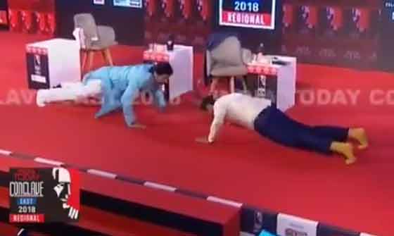 കോണ്ക്ലേവിന്റെ മോഡറേറ്ററും ഇന്ത്യാ ടുഡേ മാനേജിങ് എഡിറ്ററുമായ രാഹുല് കണ്വാള് ബിപ്ലവിനെ പുഷ്അപ് എടുക്കാനായി വെല്ലുവിളിക്കുകയായിരുന്നു. ബിപ്ലവ് ദേവ് വെല്ലുവിളി സ്വീകരിച്ചതോടെ ഇരുവരും വേദിയില് പുഷ് അപ് ആരംഭിച്ചു. ബിപ്ലവ് പുഷ്അപ് അവസാനിപ്പിച്ചപ്പോള് കാണികള് എഴുന്നേറ്റ് നിന്ന് ബിപ്ലവിനെ അനുമോദിച്ചു. ദിവസവും വ്യായാമം ചെയ്യുന്നതാണ് തന്റെ ആരോഗ്യരഹസ്യമെന്ന് ബിപ്ലവ് വെളിപ്പെടുത്തി. 15 മിനുട്ടിനുള്ളില് തനിക്ക് 150 പുഷ്അപ് വരെ എടുക്കാനാകുമെന്നും അദ്ദേഹം അവകാശപ്പെട്ടു.