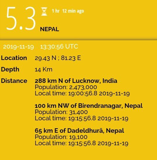 ന്യൂഡല്ഹി: നേപ്പാളിലുണ്ടായ ഭൂചലനത്തെ തുടര്ന്ന് ഡല്ഹിയിലും ഉത്തര് പ്രദേശിലും ഉണ്ടായ പ്രകമ്പനം ജനങ്ങളെ പരിഭ്രാന്തരാക്കി. ഇന്ന് രാത്രി 7.15 ന് നേപ്പാളിലെ ഇന്ത്യയുടെ അതിര്ത്തിയോട് ചേര്ന്നുള്ള വനത്തിലാണ് ഭൂചലനം രേഖപ്പെടുത്തിയിരിക്കുന്നത്. അന്താരാഷ്ട്ര ഏജന്സികള് റിച്ചര് സ്കെയിലില് 5.3 ആണ് രേഖപ്പെടുത്തിയിരിക്കുന്നത്. ലക്നോവില് നിന്നും 288 അകലെയുള്ള നേപ്പാളിലെ ഖാട്ട്പാട് നാഷണല് പാര്ക്കിലാണ് ഭൂചലനം ഉണ്ടായിരിക്കുന്നത്. രാത്രിയായത് കൊണ്ട് കൂടുതല് വിവരങ്ങള് ലഭ്യമായിട്ടില്ല. 2015 ല് ഈ പ്രദേശത്തുണ്ടായ ഭൂചലനത്തെ തുടര്ന്ന് 9000 പേര് കൊല്ലപ്പെട്ടിരുന്നു. ബഹ്റിച്ച്, നോയിഡ, ഗാസിയാബാദ് തുടങ്ങിയ പ്രദേശങ്ങളിലും പ്രകമ്പനം അനുഭവപ്പെട്ടു. ഏതാനും സെക്കന്റുകള് അനുഭവപ്പെട്ട പ്രകമ്പനത്തെ തുടര്ന്ന് പലരും കെട്ടിടങ്ങളില് നിന്നും പുറത്തേക്ക് ഓടുകയായിരുന്നു.