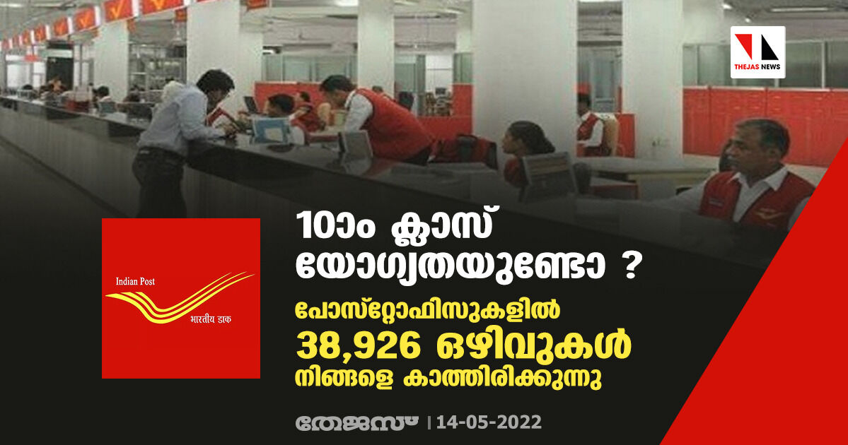 10ാം ക്ലാസ് യോഗ്യതയുണ്ടോ ? പോസ്റ്റോഫിസുകളില് 38,926 ഒഴിവുകള് നിങ്ങളെ കാത്തിരിക്കുന്നു