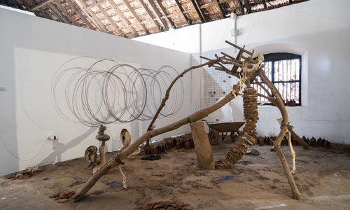 പോത്തിന്റെ എല്ലുകളില് തീര്ത്ത തൂണുകളിലാണ് കുഞ്ഞിക്കുട്ടന്, സ്മിത വിജയന്, ശരത് കുമാര്, ശ്യാമപ്രസാദ് എന്നീ വിദ്യാര്ഥികള് ഈ പ്രതിഷ്ഠാപനം ഒരുക്കിയിട്ടുള്ളത്. കാലടി സര്വകലാശാലയ്ക്കടുത്തുള്ള അറവുശാലയില് നിന്നുമാണ് ഇത് സംഘടിപ്പിച്ചത്. മട്ടാഞ്ചേരിയിലെ മുഹമ്മദലി വെയര്ഹൗസിലാണ് ഈ പ്രതിഷ്ഠാപനം സ്ഥാപിച്ചിട്ടുള്ളത്. പ്രളയബാധിത പ്രദേശങ്ങളില് നിന്നു തന്നെ ശേഖരിച്ച ചെളി, മരം, ലോഹം, കരി,മൃഗങ്ങളുടെ അസ്ഥി എന്നിവ ഉപയോഗിച്ചാണ് ഈ പ്രതിഷ്ഠാപനം സൃഷ്ടിച്ചത്.