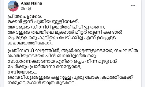 പ്രതിസന്ധി ഘട്ടത്തില്, ആള്ക്കൂട്ടങ്ങളുടെയോ, സംഘടിത ശക്തിയുടെയോ പിന് ബലമില്ലാത്ത ഒരു സാധാരണക്കാരനായ എന്റെ ഒപ്പം നിന്ന മുഴുവന് ആളുകള്ക്കും നന്ദി രേഖപ്പെടുത്തുന്നുവെന്നും അനസ് കുറിച്ചു. കുട്ടിയെ ഇനി സ്കൂളിലേക്ക് വിടില്ലെന്ന് പിതാവ് നേരത്തെ തന്നെ വ്യക്തമാക്കിയിരുന്നു. കുട്ടി മാനസികമായി ബുദ്ധിമുട്ടിലാണെന്നും ടിസി വാങ്ങുകയാണെന്നുമാണ് പിതാവ് പറഞ്ഞത്. വിഷയം കോടതിയിലെത്തുകയും ചെയ്തിരുന്നു.