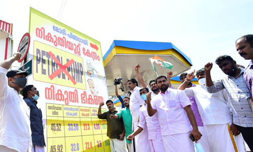 പെട്രോള് പമ്പുകളെ നികുതിയൂറ്റ് കേന്ദ്രമാക്കി യൂത്ത് കോണ്ഗ്രസ് സമരം