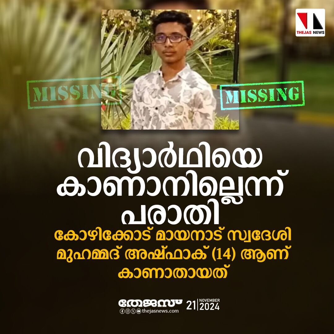 കോഴിക്കോട് ഒമ്പതാം ക്ലാസ് വിദ്യാര്ഥിയെ കാണാനില്ലെന്ന് പരാതി
