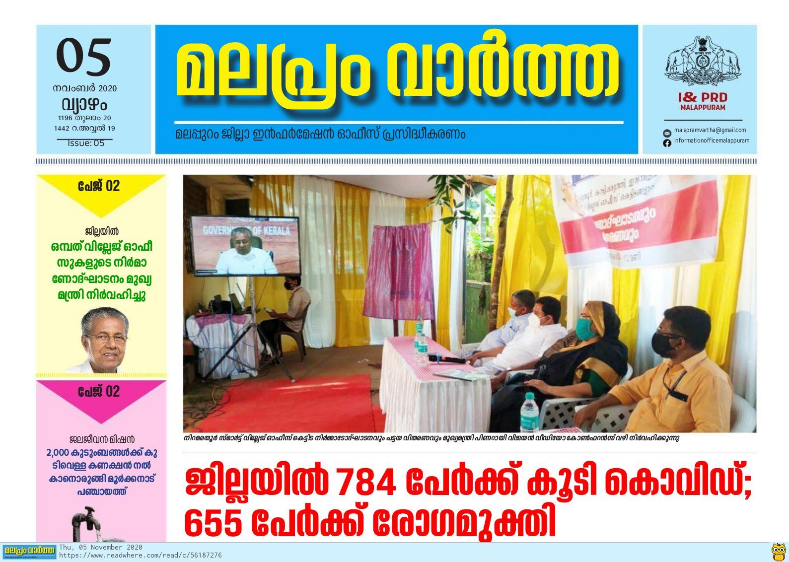 മലപ്പുറം: സര്ക്കാറിന്റെ വികസന ക്ഷേമ പ്രവര്ത്തനങ്ങളും പ്രധാന അറിയിപ്പുകളും ജനങ്ങളിലെത്തിക്കാന് മലപ്പുറം ജില്ലാ ഇന്ഫര്മേഷന് ഓഫിസ് തയ്യാറാക്കിയ ഇ-പേപ്പര് 'മലപ്രം വാര്ത്ത' ഇനി മുതല് സൗജന്യമായി ലഭിക്കും. Readwhere.com എന്ന ഡിജിറ്റല് പ്ലാറ്റ് ഫോമിലൂടെയാണ് ഇ-പേപ്പര് ലഭിക്കുക. വായനാക്കാര്ക്ക് https://www.readwhere.com/newspaper/malapramvaartha/Malapram-Vaartha/33495?refquery=MALAPRAM എന്ന ലിങ്കിലൂടെ മലപ്രം വാര്ത്ത സബ്സ്ക്രൈബ് ചെയ്യാവുന്നതാണ്. വായനക്കാര്ക്ക് വാര്ത്തകള് വളരെ എളുപ്പത്തില് വായിക്കാനും ആവശ്യമായവ ഷെയര്ചെയ്യാനും ക്ലിപ്പുകളായെടുക്കാനും വേഗത്തില് കഴിയും. ഇ-പേപ്പറിന്റെ പ്രകാശനം ഇന്ഫര്മേഷന് ആന്റ് പബ്ലിക് റിലേഷന്സ് വകുപ്പ് ഡയറക്ടര് എസ് ഹരികിഷോര് തിരുവനന്തപുരത്ത് നിര്വഹിച്ചു.