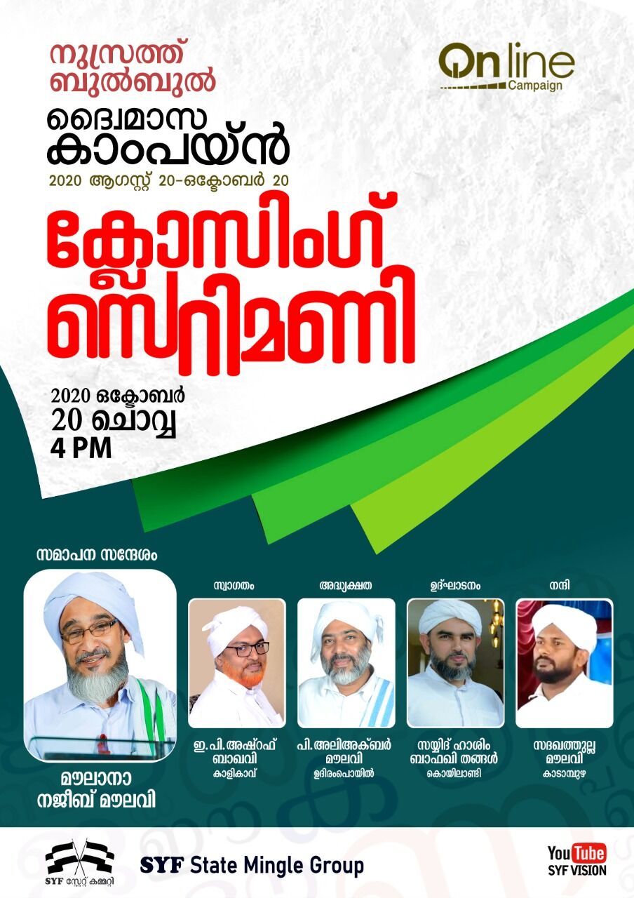 മലപ്പുറം: സുന്നി യുവജന ഫെഡറേഷന് സംസ്ഥാന കമ്മറ്റിക്കുകീഴില് ആഗസ്ത് 20ന് ആരംഭിച്ച എസ്വൈഎഫ് നുസ്രത്ത്ബുല്ബുല് ദൈ്വമാസ കാംപയ്ന് സമാപിച്ചു. സംസ്ഥാന ജംഇയ്യത്തുല് ഉലമാ ജനറല് സെക്രട്ടറിയും നുസ്രത്ത്ബുല്ബുല് പത്രാധിപരുമായ മൗലാനാ എ നജീബ് മൗലവി സമാപന സന്ദേശം നല്കി.