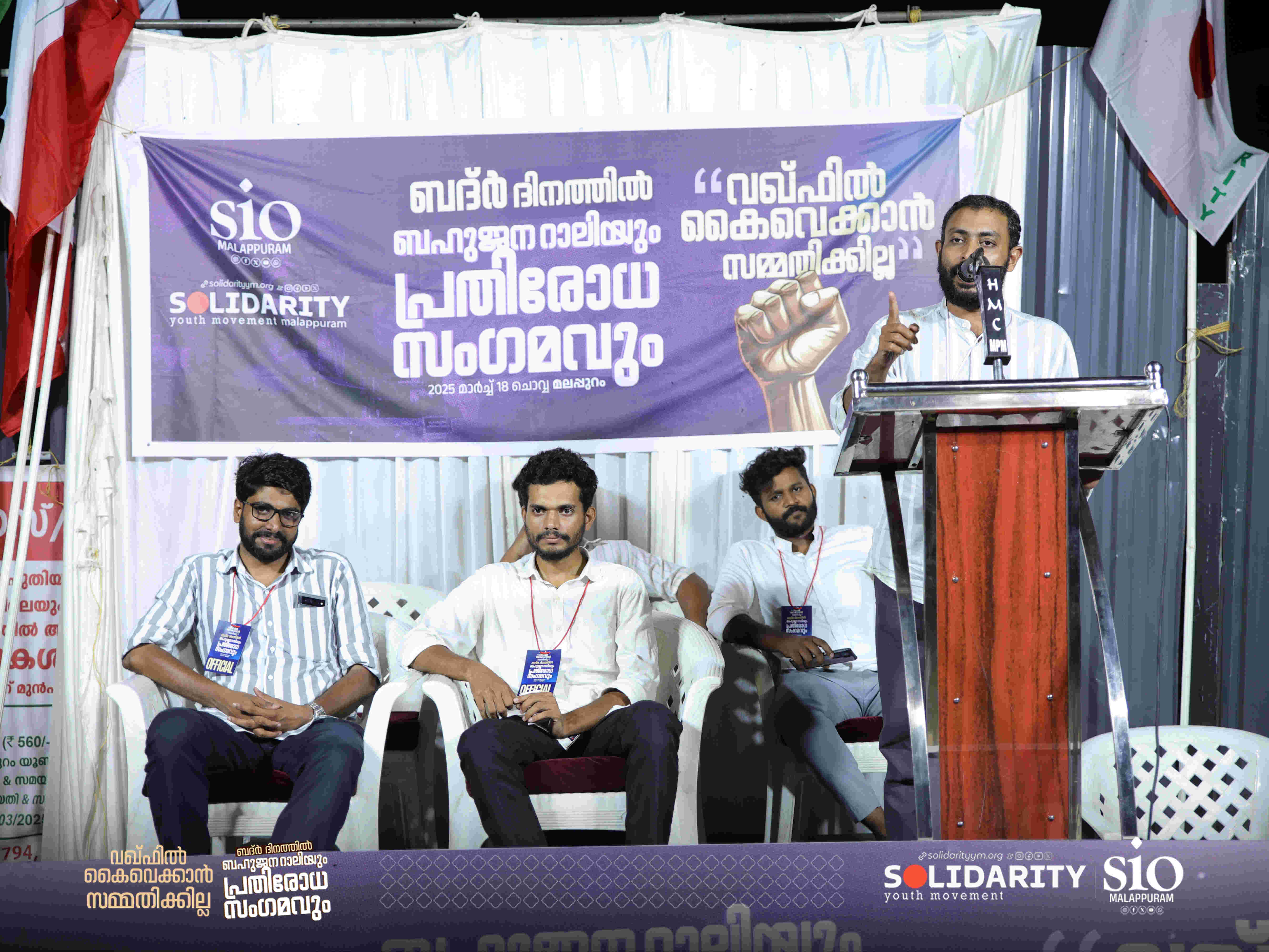 മലപ്പുറം: 'സാമൂഹിക-സാമുദായിക വികസനത്തിനായി ഇന്ത്യയുടെ വ്യത്യസ്ത ഭാഗങ്ങളിലായി ഉഴിഞ്ഞുവെച്ച സമ്പത്ത് ഏതുവിധേനെയും സംരക്ഷിക്കുമെന്ന്' വഖ്ഫ് സംരക്ഷണ സംഗമം അഭിപ്രായപ്പെട്ടു. വഖ്ഫില് കൈവയ്ക്കാന് സമ്മതിക്കില്ല എന്ന തലക്കെട്ടില് വഖ്ഫ് നിയമ ഭേദഗതിക്കെതിരെ ബഹുജനാറാലിയും പ്രതിരോധസംഗമവും സംഘടിപ്പിച്ചു. ആയിരത്തില്പരം വരുന്ന യുവജന-വിദ്യാര്ഥി റാലി മലപ്പുറം കോട്ടപ്പടിയില് നിന്നും തുടങ്ങി കുന്നുമ്മലില് അവസാനിച്ചു. റാലിയാനന്തരം നടന്ന പ്രതിരോധസംഗമത്തില് പ്രമുഖര് സംവദിച്ചു. എസ്.ഐ.ഒ. ജില്ല പ്രസിഡന്റ് അഡ്വ. അസ്ലം പള്ളിപ്പടി സ്വാഗതമാശംസിച്ചു. സോളിഡാരിറ്റി ജില്ല പ്രസിഡന്റ് സാബിക് വെട്ടം അധ്യക്ഷത വഹിച്ചു. ജമാഅത്തെ ഇസ്ലാമി സംസ്ഥാന സെക്രട്ടറി ശിഹാബ് പൂക്കോട്ടൂര് ഉദ്ഘാടനം നിര്വഹിച്ചു. എസ്.ഐ.ഒ കേന്ദ്രകമ്മിറ്റിയംഗം വാഹിദ് ചുള്ളിപ്പാറ മുഖ്യപ്രഭാഷണം നടത്തി. ജി.ഐ.ഒ. സംസ്ഥാന ജനറല് സെക്രട്ടറി അഫ്ര ശിഹാബ് ആശംസയര്പ്പിച്ചു. നാഷണല് ഫെഡറേഷന് ഓഫ് യൂത്ത് മൂവ്മെന്റ് ചെയര്മാന് സി. ടി. സുഹൈബ് സമാപന പ്രഭാഷണം നടത്തി.