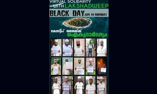 പത്തനംതിട്ട: ലക്ഷദ്വീപ് അഡ്മിനിസ്ട്രേറ്ററുടെ സന്ദര്ശനത്തില് പ്രതിഷേധിച്ച് ദ്വീപില് ആചരിച്ച കരിദിനത്തിന് കേരളാ മുസ്ലിം യുവജന ഫെഡറേഷന് പത്തനംതിട്ട ജില്ലാ കമ്മിറ്റി 'വെര്ച്വല് സോളിഡാരിറ്റി വിത് ലക്ഷദ്വീപ് ബ്ലാക്ക് ഡേ' എന്ന ശീര്ഷകത്തില് ഐക്യദാര്ഢ്യം അറിയിച്ചു.