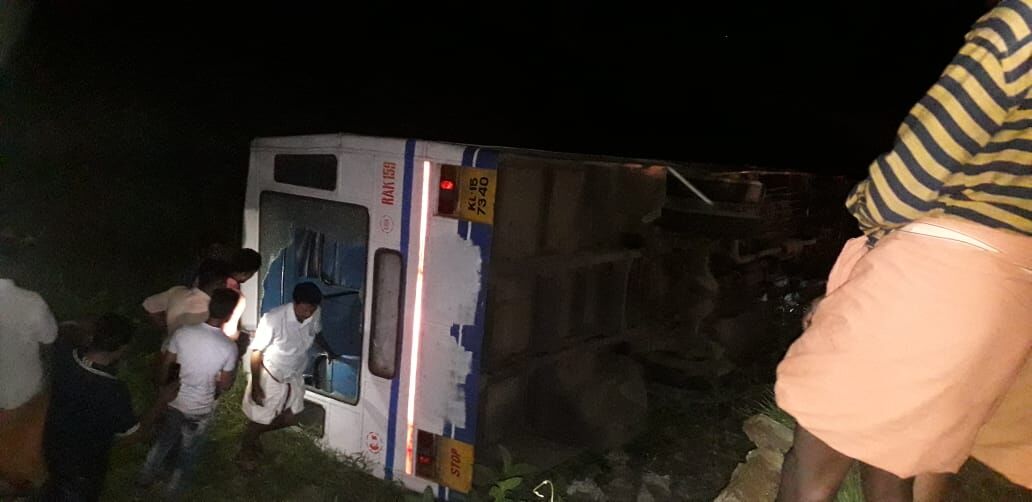 ഇന്നുരാത്രി 7.30 ഓടെയാണ് അപകടമുണ്ടായത്. മദ്യപിച്ച് ബസ്സിന് മുന്നിൽ കയറിയ ആളെ രക്ഷിക്കാനുള്ള ശ്രമത്തിനിടെ നിയന്ത്രണം നഷ്ടപ്പെട്ടതോടെയാണ് ബസ് പാടത്തേക്ക് മറിഞ്ഞത്.