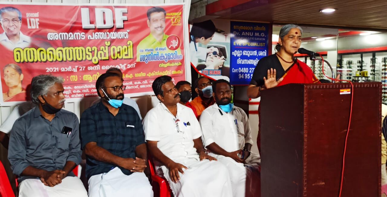 കൊടുങ്ങല്ലൂര് നിയോജക മണ്ഡലം സ്ഥാനാര്ത്ഥി വി ആര് സുനില്കുമാറിന്റെ അന്നമനടയിലെ തിരഞ്ഞെടുപ്പ് റാലിയും പൊതു യോഗവും ഉദ്ഘാടനം ചെയ്യുകയായിരുന്നു അവര്. കേന്ദ്ര സര്ക്കാര് നിരവധി നിയമങ്ങള് കൊണ്ട് ജനാധിപത്യ മൂല്യങ്ങളെ തകര്ത്ത് ജനജീവിതം ദുരിതത്തിലാക്കുകയാണന്നും ആനിരാജ പറഞ്ഞു.