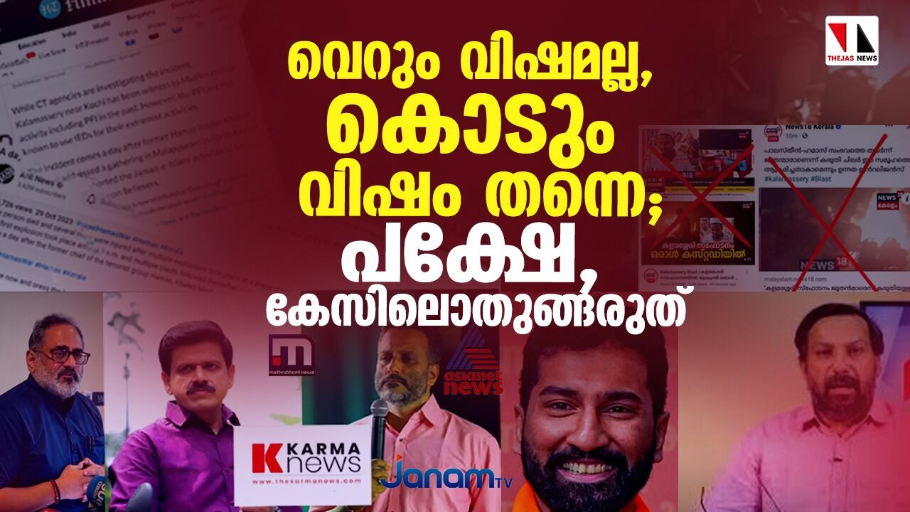 കുറഞ്ഞ മാസങ്ങള്ക്കിടയില് എത്രയെത്ര സംഭവങ്ങളുടെ പേരിലാണ് കേരളത്തെ തകര്ക്കാനായി ശ്രമിച്ചത്. എലത്തൂര് ട്രെയിന് തീവയ്പ്, കണ്ണൂര് ട്രെയിന് തീവയ്പ്, പാലക്കാട്ട് ജവാന്റെ ശരീരത്തിലെ പിഎഫ് ഐ വ്യാജ ചാപ്പ കുത്തല്, കുമ്പളയില് വിദ്യാര്ഥിനികള് ബസ് നിര്ത്താത്തതില് പ്രതിഷേധിച്ചതിനെതിരായ വര്ഗീയ പ്രചാരണം... ഇതിലെല്ലാം സംഘപരിവാരത്തിനൊപ്പം തന്നെ വെറുപ്പ് പ്രചരിപ്പിച്ചവരില് മേല്ക്കോയാമാ മാധ്യമങ്ങളുണ്ട്. ഓണ്ലൈന്, യൂട്യൂബ് ചാനലുകളുണ്ട്. കളമശ്ശേരി സ്ഫോടന പരമ്പരയിലും പ്രതി ഡൊമിനിക് മാര്ട്ടിന് സ്വയംഭൂവാകുന്നതിനു മുമ്പ് ഇതേ മാനസികാവസ്ഥയിലൂടെയാണ് മാധ്യമങ്ങളില് മിക്കതും സഞ്ചരിച്ചത്. മാര്ട്ടിന്റെ കുറ്റസമ്മതം പോലും സമ്മതിക്കാന് മടിച്ച ചാനലുകളെയും നാം കണ്ടു. ഇപ്പോള് തന്നെ, പ്രധാനവാര്ത്തകളില് നിന്ന് കളമശ്ശേരി ബോംബ് സ്ഫോടന പരമ്പര മാഞ്ഞുപോവുകയാണ്. കേരള ചരിത്രത്തില് തന്നെയുണ്ടായ ഏറ്റവും വലിയ ആസൂത്രിത ബോംബ് സ്ഫോടനത്തില് ഗൂഢാലോചനകളൊന്നുമില്ലെന്നും ഒറ്റയ്ക്കാണ് നടത്തിയതെന്നും മാധ്യമങ്ങള് വിധിയെഴുതിക്കഴിഞ്ഞു. രാജീവ് ചന്ദ്രശേഖര്മാരും അനില് ആന്റണിമാരും ഇനിയും വരും. അവര് സുവര്ണാവസരം കാത്തുനില്പ്പുണ്ട്. ജാഗ്രതയൊന്നും പോരാ, അതീവ ജാഗ്രത തന്നെ വേണം. കാരണം, ഇത് ഏതെങ്കിലും മുന്നണിക്കോ സര്ക്കാരിനോ എതിരെയുള്ള ആക്രമണമല്ല. കേരളത്തിനെതിരായ യുദ്ധപ്രഖ്യാപനമാണ്. ഭാഗ്യം കൊണ്ട് മാത്രമാണ് പലപ്പോഴും രക്ഷപ്പെടുന്നത്. എന്നാലത് എപ്പോഴും സംഭവിക്കണമെന്നില്ല. ലോക്സഭാ തിരഞ്ഞെടുപ്പ് അടുത്തിരിക്കുകയാണ്. കൊടുംവിഷം ചീറ്റുന്നത് കേന്ദ്രമന്ത്രിയായാലും അവരുടെ ശിങ്കിടികളായാലും മാധ്യമമേലങ്കിയണിഞ്ഞ വിദ്വേഷപ്രചാരകരായാലും കടുത്ത നടപടിയെടുത്തേ തീരൂ. എല്ലാം പതിവുപോലെ കേസെടുക്കലിലും ബ്രേക്കിങ് ന്യൂസുകളിലും ഒതുങ്ങുകയാണെങ്കില് ഇനിയുള്ള കാലവും കൊടുംവിഷം കൊണ്ട് കേരളമാകെ മലിനമാവും. അപ്പോള് കത്തിത്തീരുന്നത് ഏതെങ്കിലുമൊരു സമൂഹമായിരിക്കില്ല, കേരളമെന്ന മോഡലായിരിക്കും. മലയാളിയെന്ന അഭിമാനമായിരിക്കും.