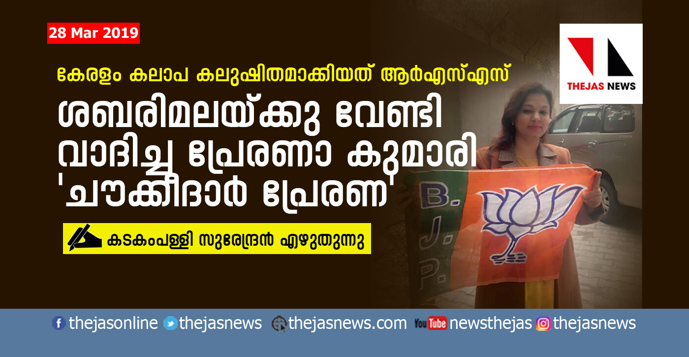 പ്രേരണാകുമാരി ബിജെപിക്കാരിയാണെന്ന് ഞാന് പ്രസംഗിച്ചതിന് എനിക്കെതിരേ ഒരു സുപ്രീംകോടതി അഭിഭാഷകന് വഴി വക്കീല് നോട്ടീസ് അയച്ച പ്രേരണാകുമാരി കേസ് കൊടുക്കാന് തയ്യാറായില്ല. അന്ന് മുങ്ങിയ പ്രേരണാകുമാരി ഇപ്പോള് ചൗക്കീദാര് പ്രേരണയാണ്. ദില്ലിയിലെ ബിജെപി നേതൃനിരയിലുള്ള പ്രേരണാകുമാരി ബിജെപി ലീഗല് സെല്ലിന്റെ സുപ്രീംകോടതി യൂണിറ്റ് സെക്രട്ടറിയും, ബിജെപി പോഷകസംഘടനയുടെ ഔദ്യോഗിക വക്താവുമാണ്. ബിജെപിയുടെ നേതൃനിരയില് പെട്ട പ്രേരണാകുമാരിയെ കൊണ്ട് ശബരിമല യുവതീ പ്രവേശനത്തിനായി കേസ് നല്കിയതിന് പിന്നിലെ ഗൂഢശക്തി ആരെന്നത് ഇപ്പോള് പകല് പോലെ വ്യക്തമാണ്.